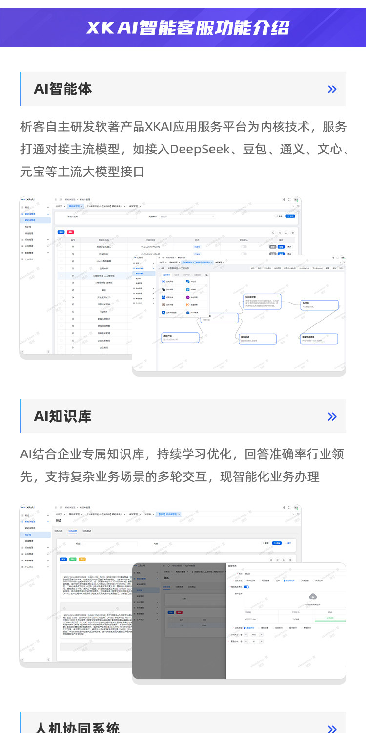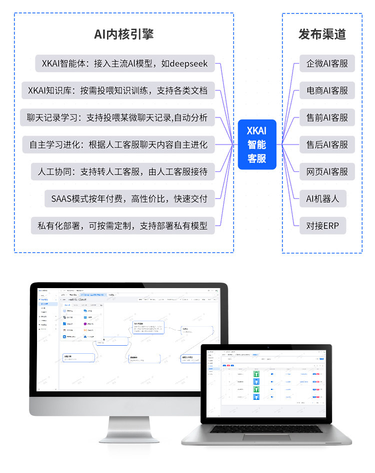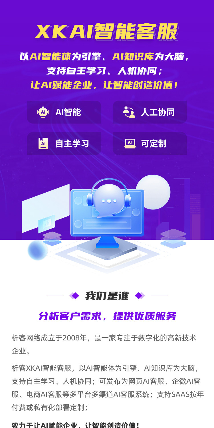 析客XKAI智能客服,以AI智能体为引擎、AI知识库为大脑,支持自主学习、人机协同;可发布为网页AI客服、企微AI客服、电商AI客服等多平台多渠道AI客服系统;支持SAAS按年付费或私有化部署定制;