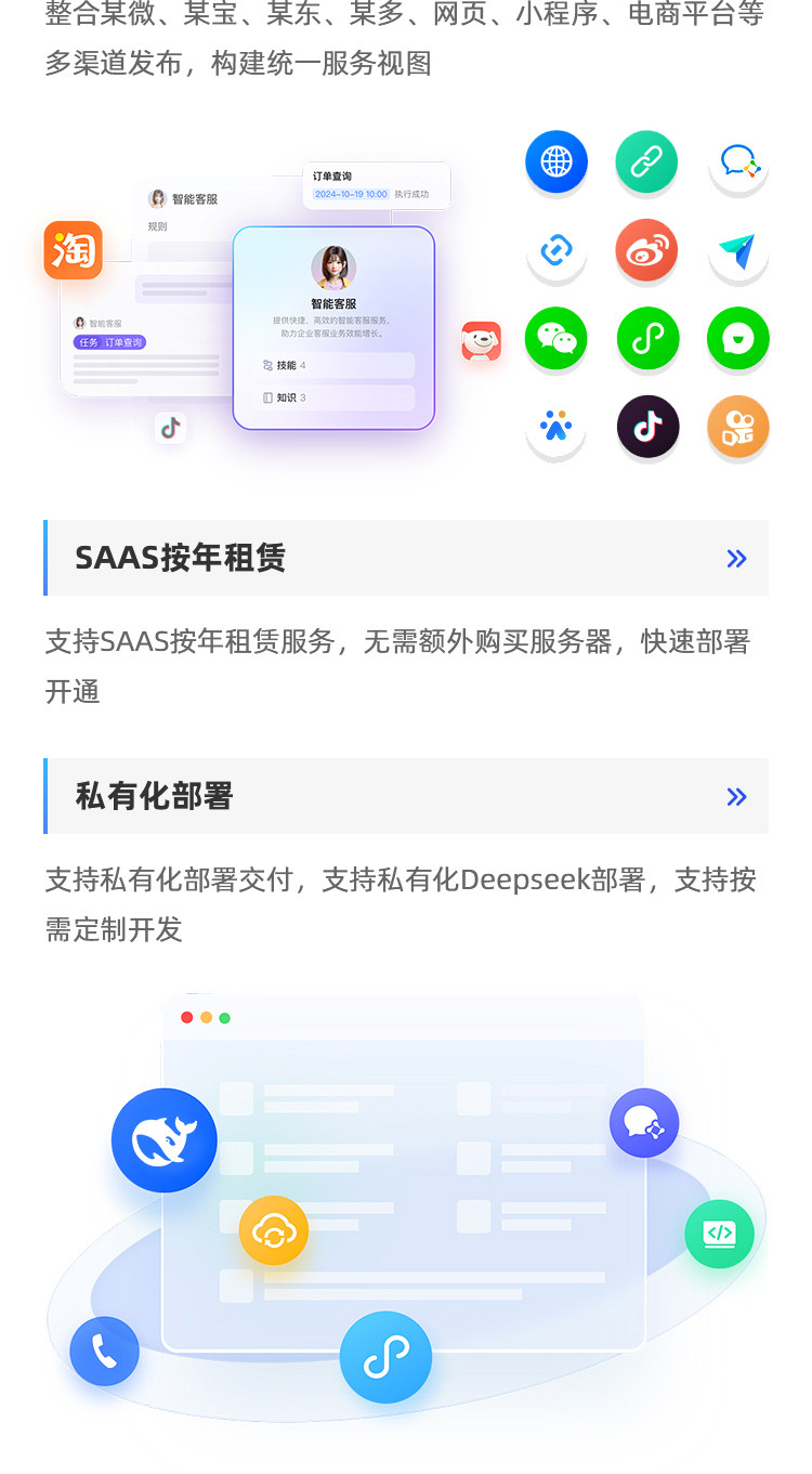 6. 多渠道发布:整合某微、某宝、某东、某多、网页、小程序、电商平台等多渠道发布,构建统一服务视图。