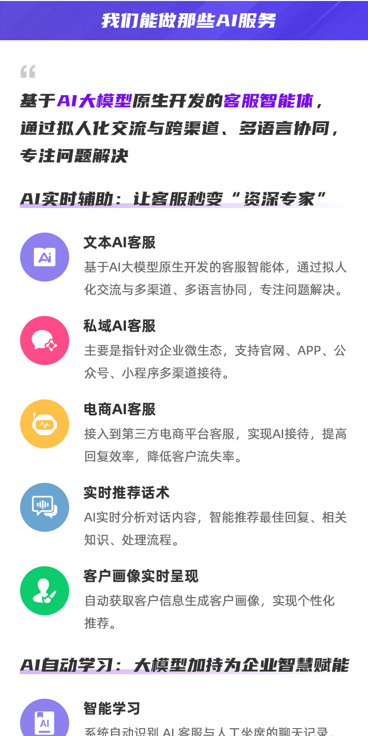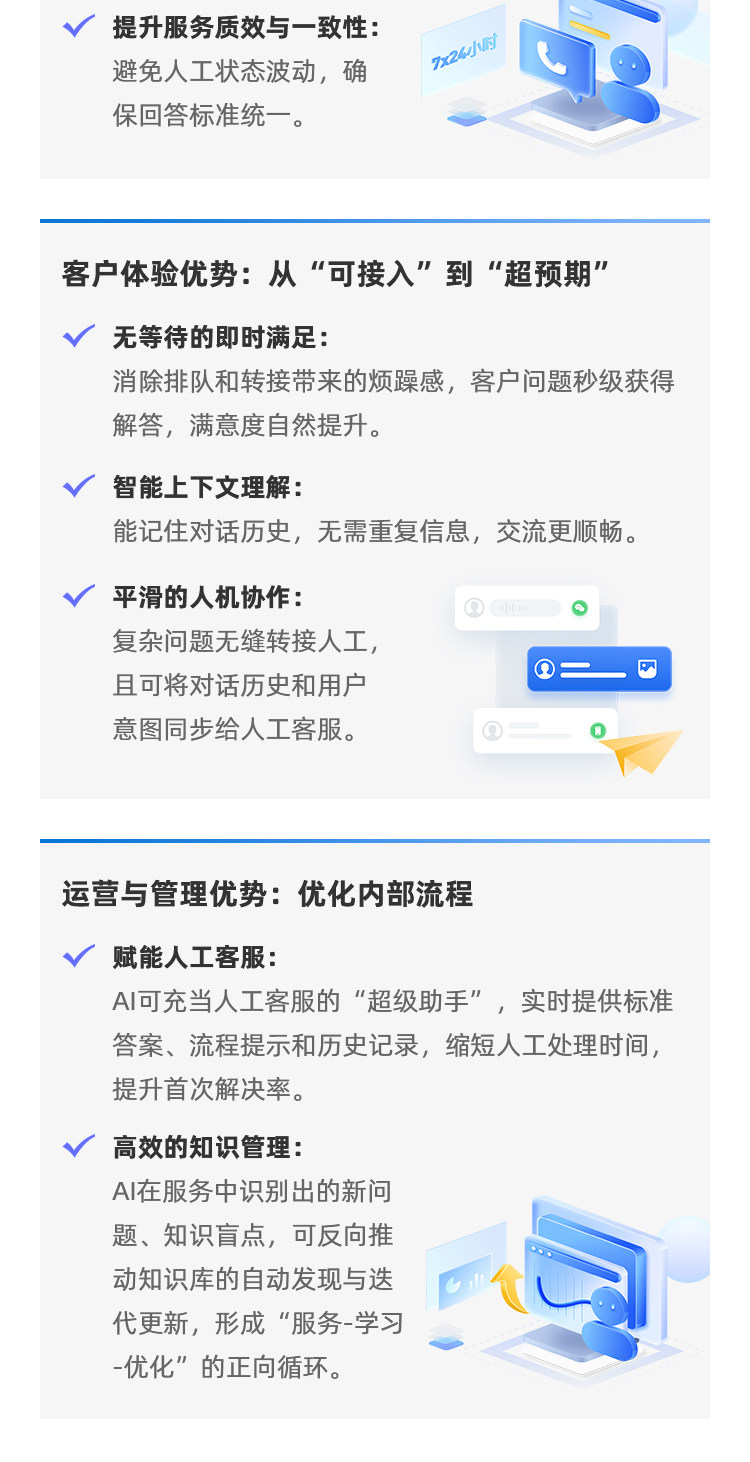 高效的知识管理:AI在服务中识别出的新问题、知识盲点,可反向推动知识库的自动发现与迭代更新,形成“服务-学习-优化”的正向循环。